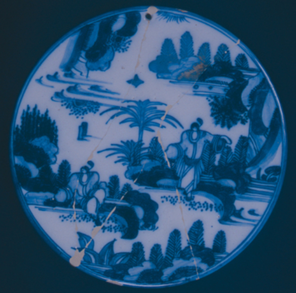 | 5c decoratie | aan overgangsporselein ontleend decor van gestileerde Chinezen in landschap blauwe beschildering |