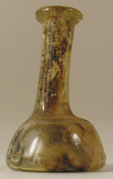 | 4b | kleine halfbolvormige fles met lange hals, opgestoken bodem met pontilmerk |