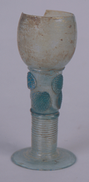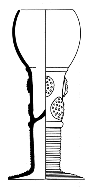 | 4b | roemer met ei-of tonvormige cuppa, geribde draad op de overgang naar de schacht en één of meer verspringende rijen braamnoppen, opgestoken bodem met pontilmerk, naar boven cilindrisch uitlopende hoge gewonden gewonden draadvoet |