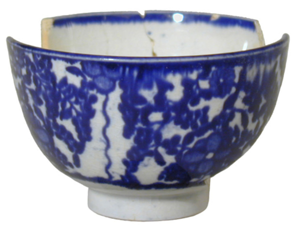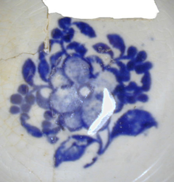 | 5c | buitenzijde: drukdecor bloemen en bladderen, blauw op wit, binnenzijde: drukdecor bloem en blad op bodem onderglazuur blauw |