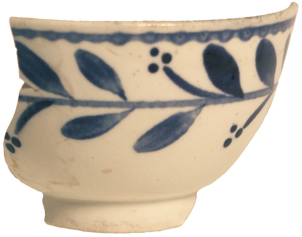 | 5c | buitenzijde: gestileerde bloemen en bladeren bovenzijde kop, blauw op wit, binnenzijde: blad en bies op de rand, blauw op wit onderglazuur blauw |