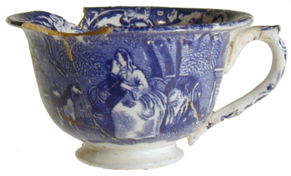 | 5c | buitenzijde: drukdecor met vrouw met boek op schoot en jong meisje en toekijkende hond, blauw op wit, binnenzijde: idem onderglazuur blauw |