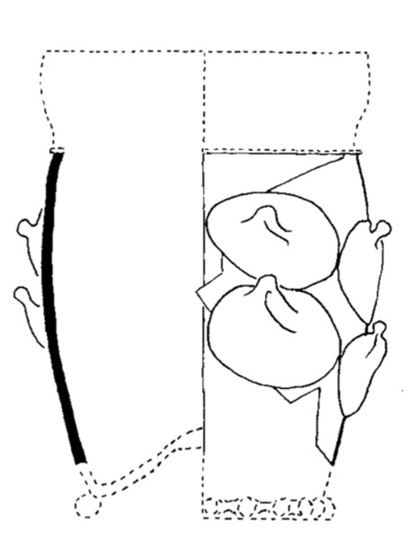 | 4b | hoge cilindrische licht buikige koolstronk met toegebogen lip, verticale rijen verspringende rijen van twee en/of drie opgerichte puntnoppen, horizontale draad onder lip, opgestoken bodem met pontilmerk, voetring |