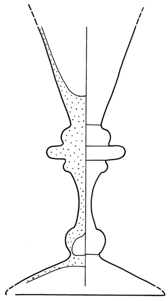 | 4b vorm | trechter- of tulp- of trompetvormig kelkglas met dikwandige bodem, massieve stam met drie geledingen en schijfje, ook met luchtbel, voet met pontilmerk |
