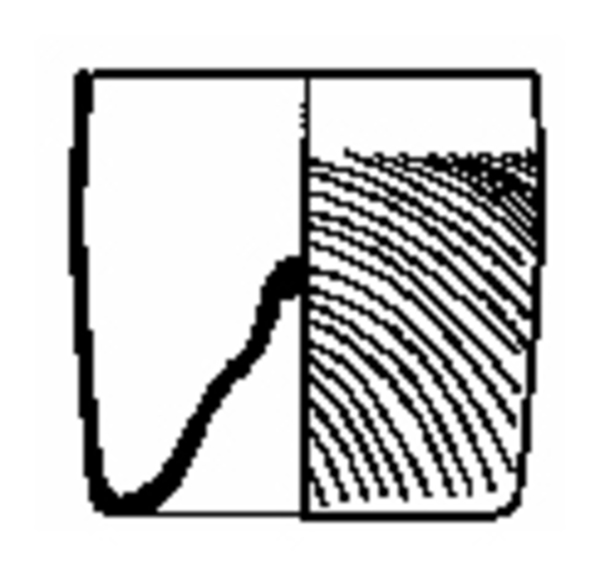 | 4b vorm | cilindrische beker met verticaal of naar rechts- of links draaiend ribbelpatroon, opgestoken bodem met pontilmerk |