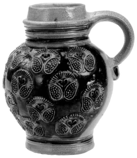 | 5c decoratie | uitwendig: stilistische bloemknoppen in reliëf; stempel uitwendig: blauw en paars krul bij ooraanzet |
