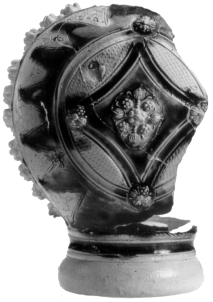 | 4b | rondbuikige kan met hoge nauwe hals met ribbels, met reliëfversiering, hoge standvoet |